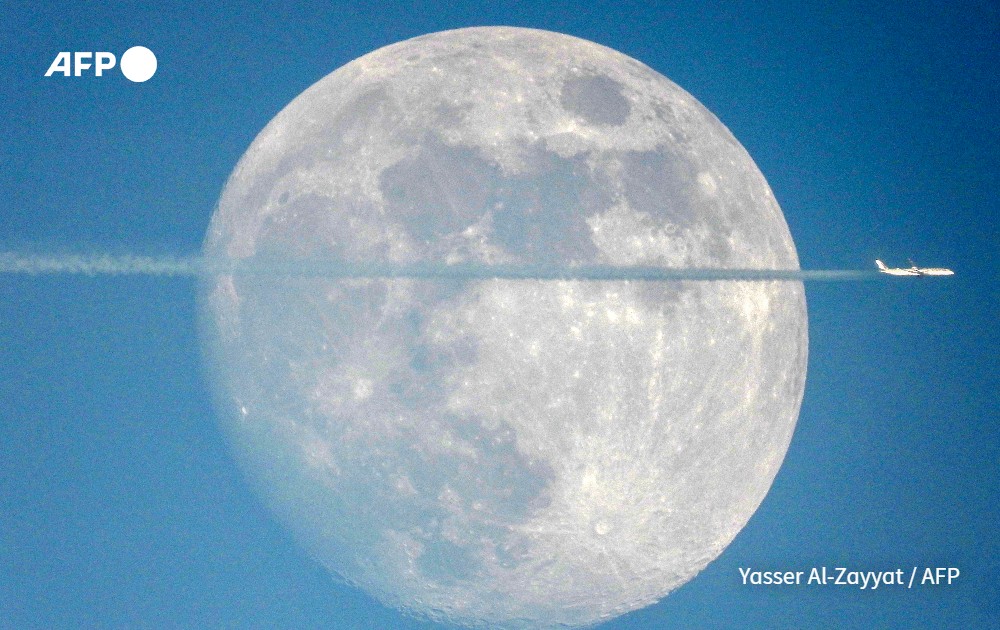 A commercial airline aircraft flies past the rising moon above Kuwait City on November 25, 2023.