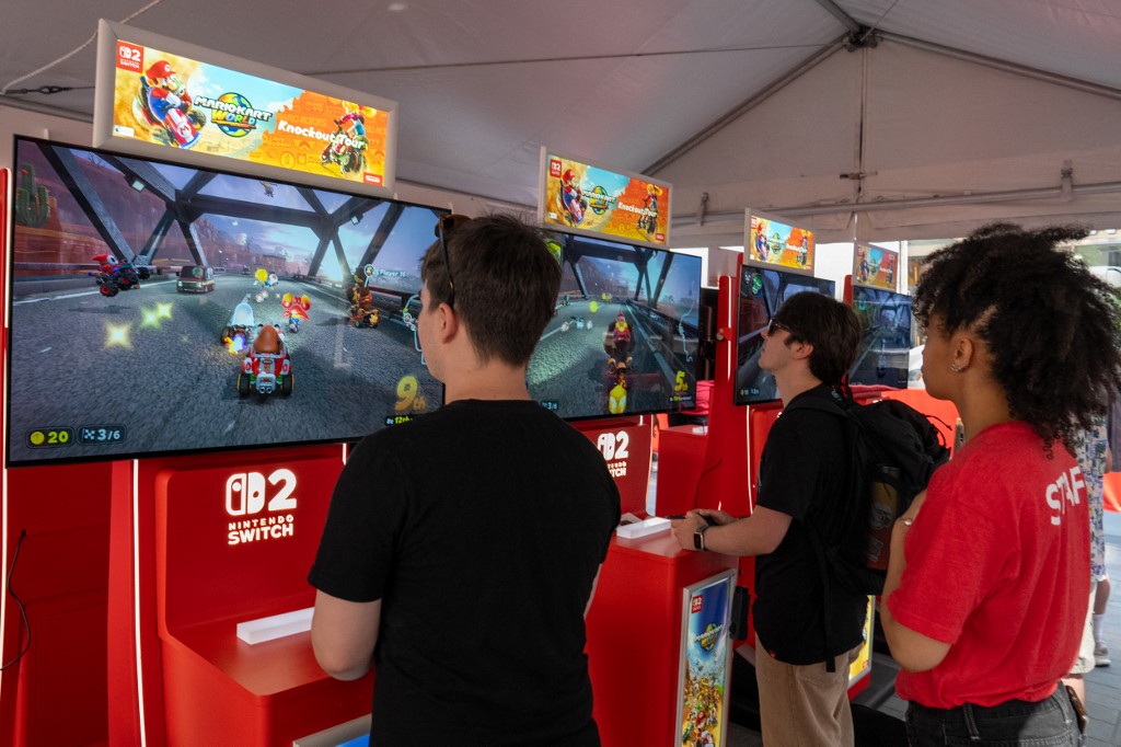 Des joueurs testent Mario Kart World durant une soirée de lancement de la console Switch 2 au magasin Nintendo de New York, le 4 juin 2025. © David Dee Delgado / AFP
